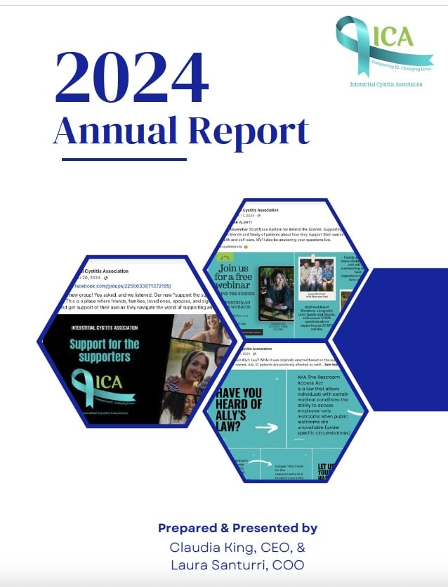 Interstitial Cystitis Association (ICA) annual reports review accomplishments of the ICA, the primary interstitial cystitis/bladder pain syndrome (IC/BPS) nonprofit charitable organization in the United States. The ICA follows best practices for nonprofit organizations. The Board of Directors, comprised of volunteer professionals, some of who are also IC patients, guides ICA organizational priorities. Annual financial audits are conducted by an independent auditing firm.