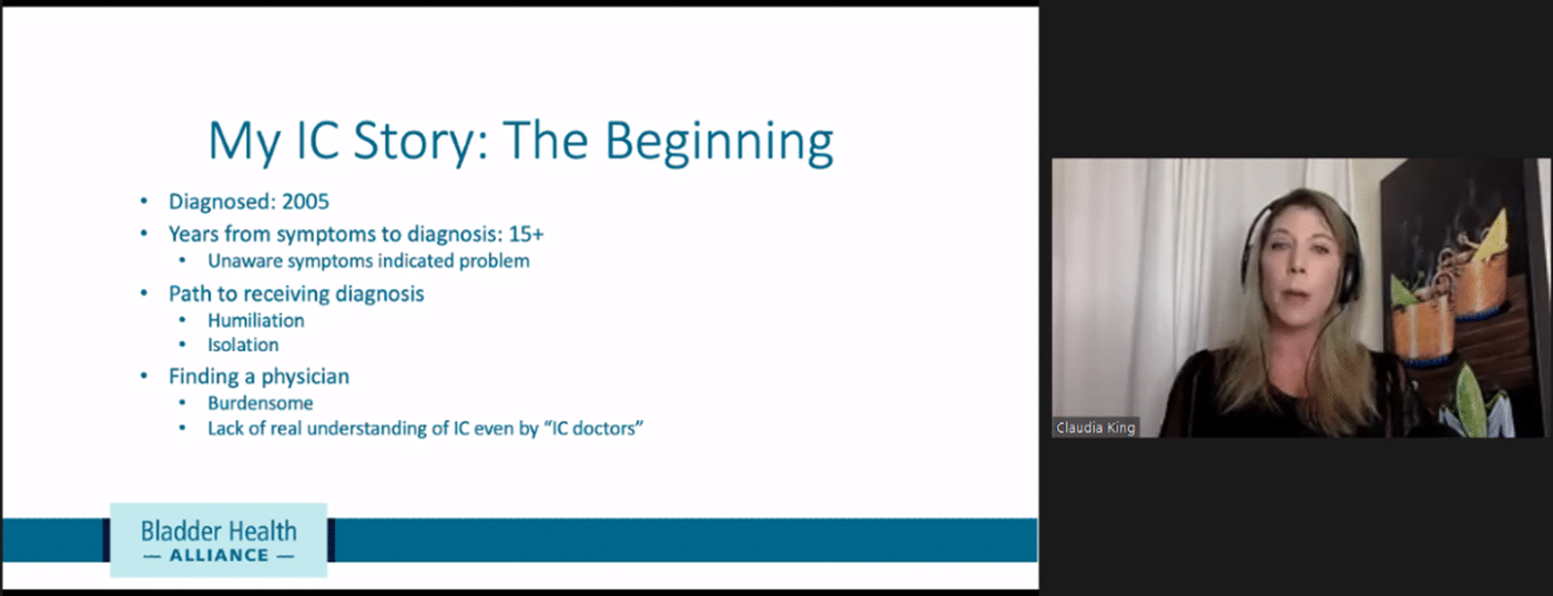 ICA Board Member and IC patient, Claudia King served as a panelist for a “Women and Bladder Health” session that was presented to the AUA’s Bladder Health Alliance Roundtable last week. She discussed how difficult it is for a woman to get a diagnosis of IC and other barriers to care/stigma associated with it.