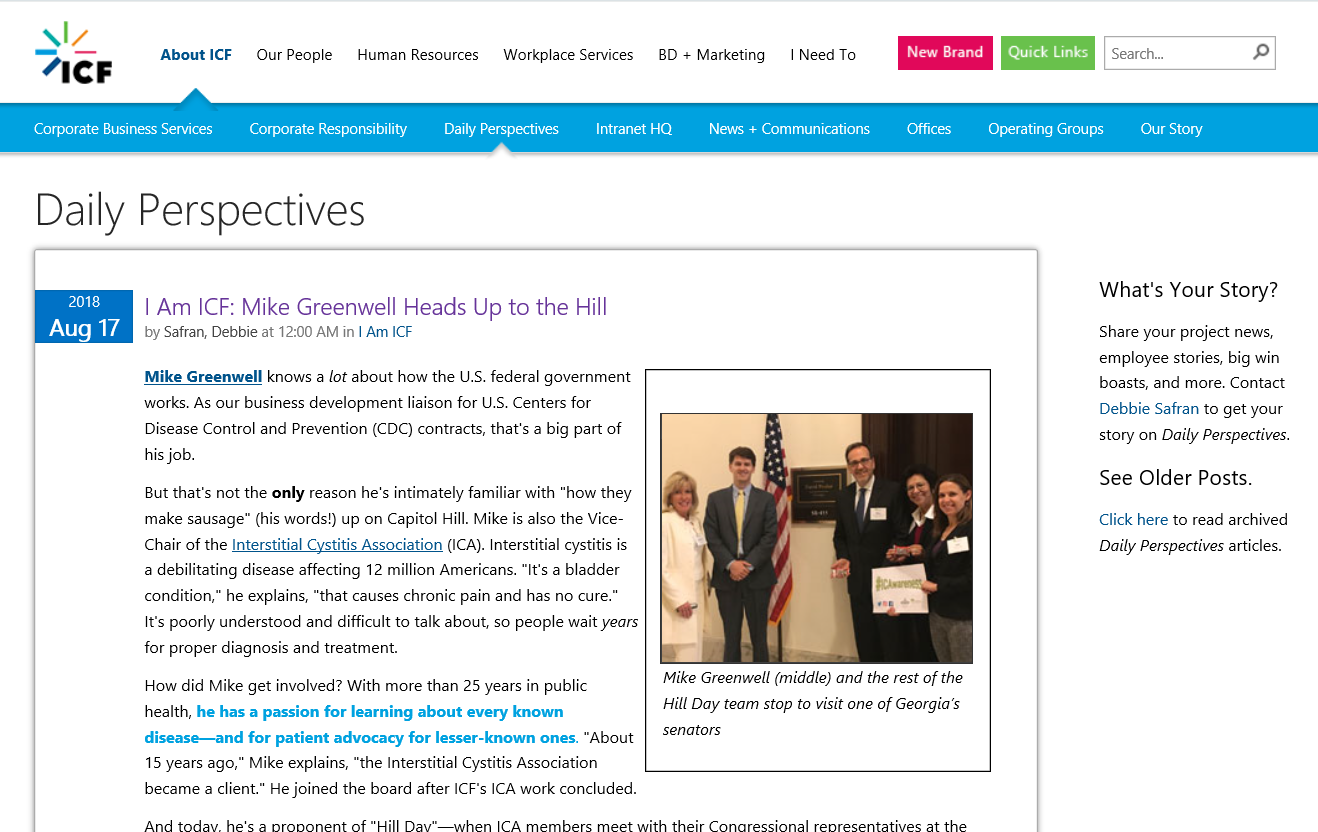 ICA Board member Michael Greenwell is raising awareness through his workplace. On August 17, 2018, his company published an article on their workplace intranet, I Am ICF, that showcases the volunteer work that he does for the Interstitial Cystitis Association (ICA) and the IC community.