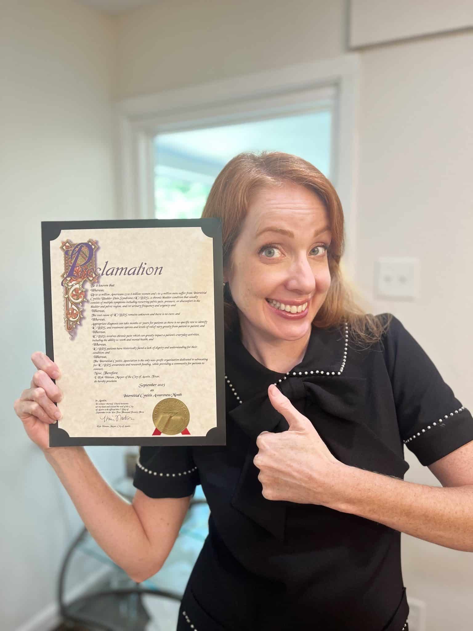 Now, THEREFORE, I, (Mayor X or Governor X), do hereby proclaim September (insert year) as: Interstitial Cystitis Awareness Month