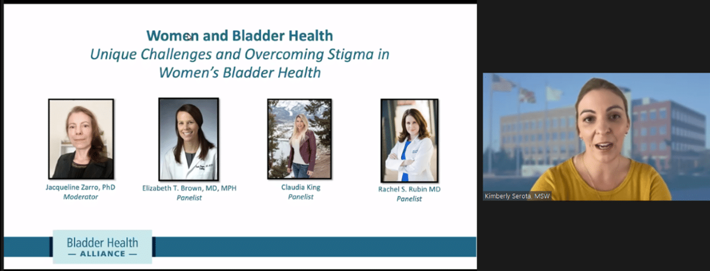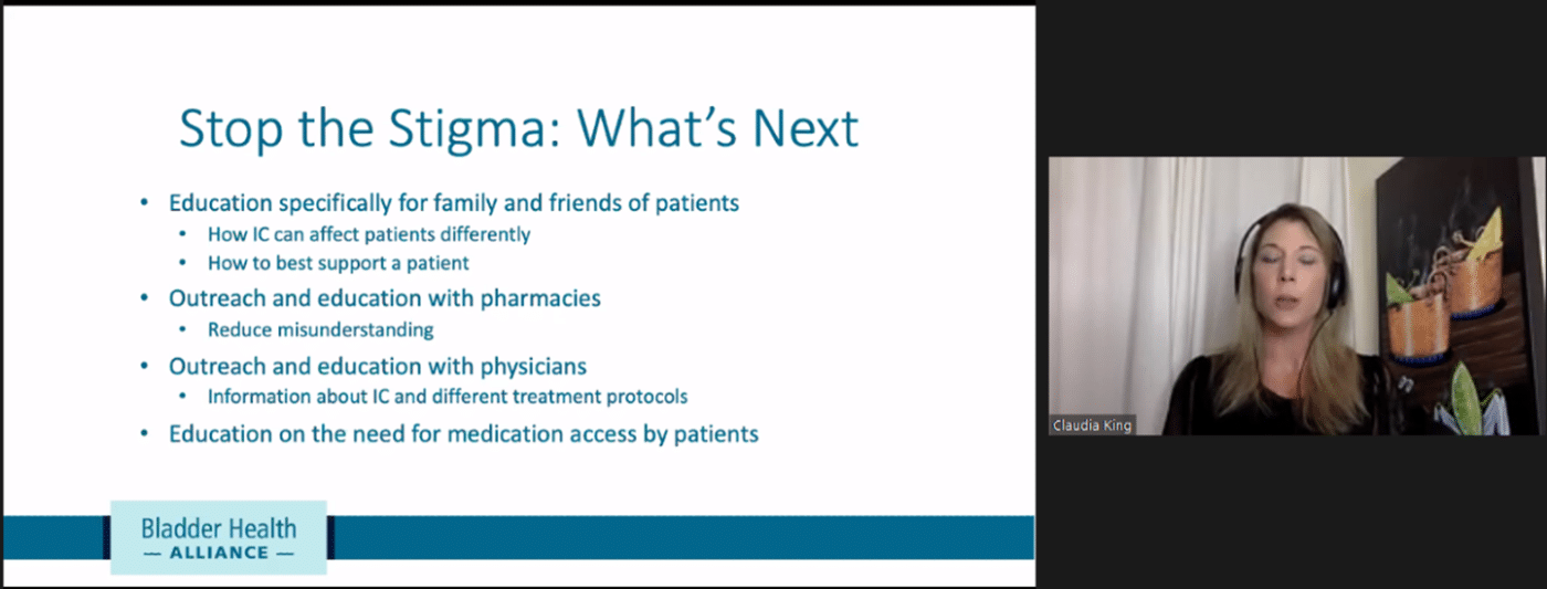 ICA Board Member and IC patient, Claudia King served as a panelist for a “Women and Bladder Health” session that was presented to the AUA’s Bladder Health Alliance Roundtable last week. She discussed how difficult it is for a woman to get a diagnosis of IC and other barriers to care/stigma associated with it.