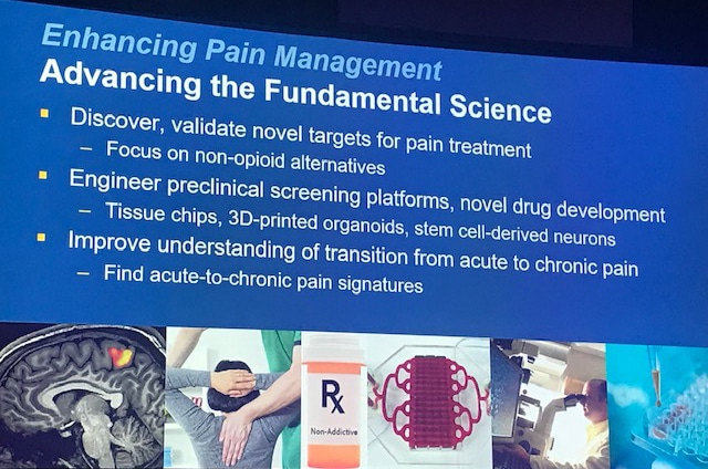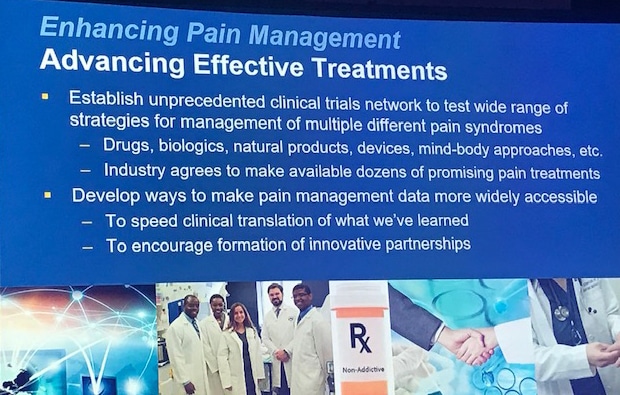 This week at the 2019 RX Drug Abuse and Heroin Summit, Dr. Francis Collins, NIH Director, presented the Institute’s strategy to address pain management in the midst of a national opioids abuse crisis. The two slides below outline how NIH is devoting millions in research dollars to advance the fundamental science of pain management and advancing effective treatments.
