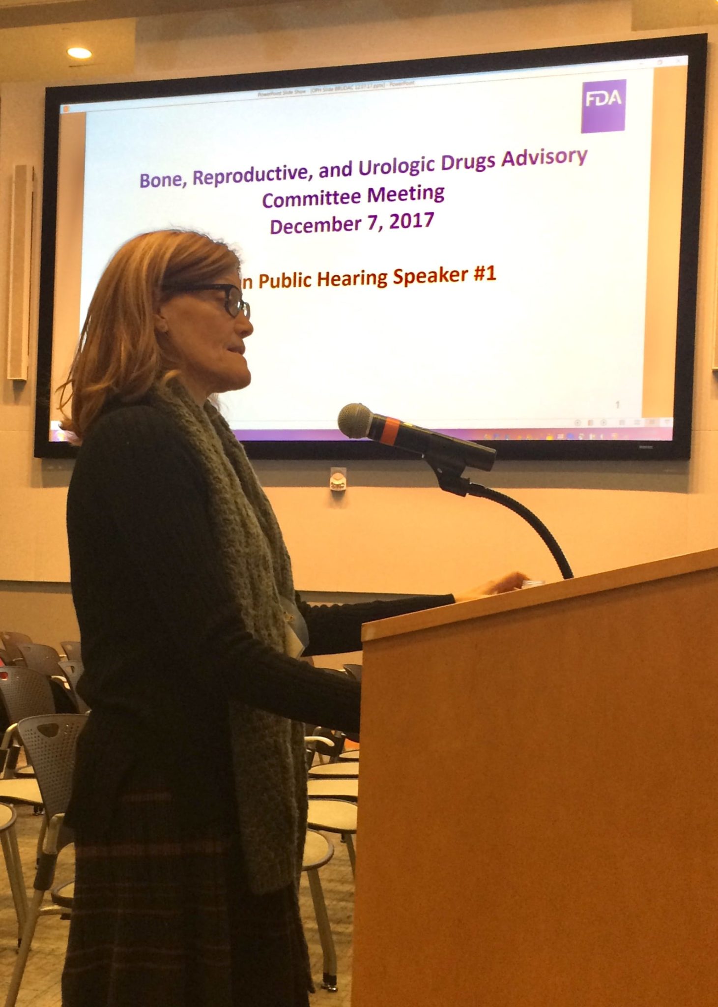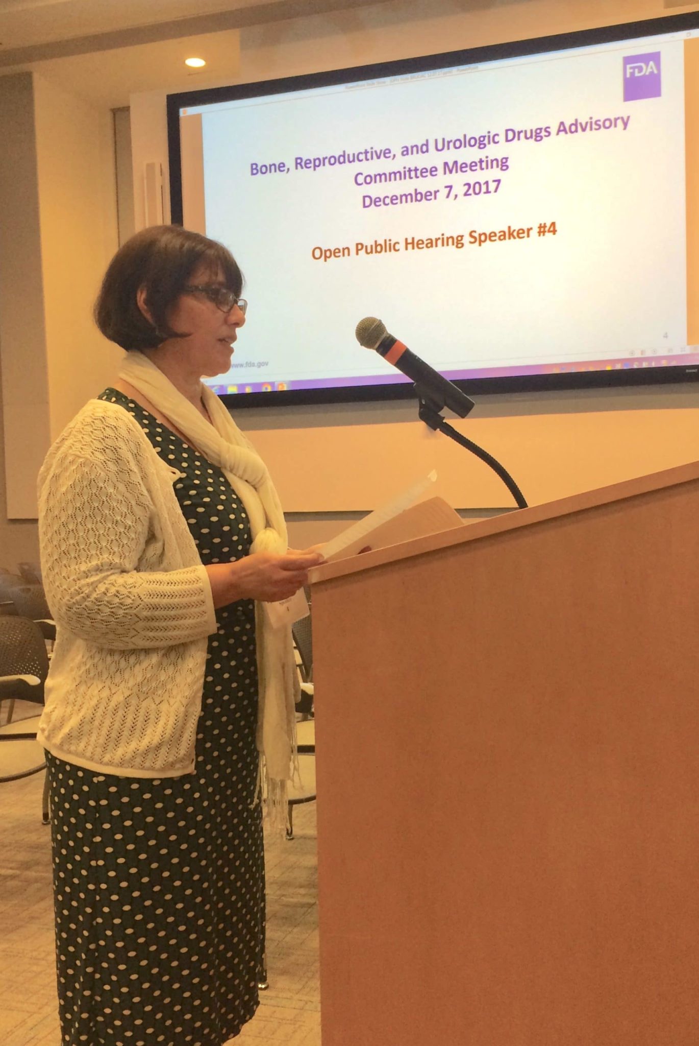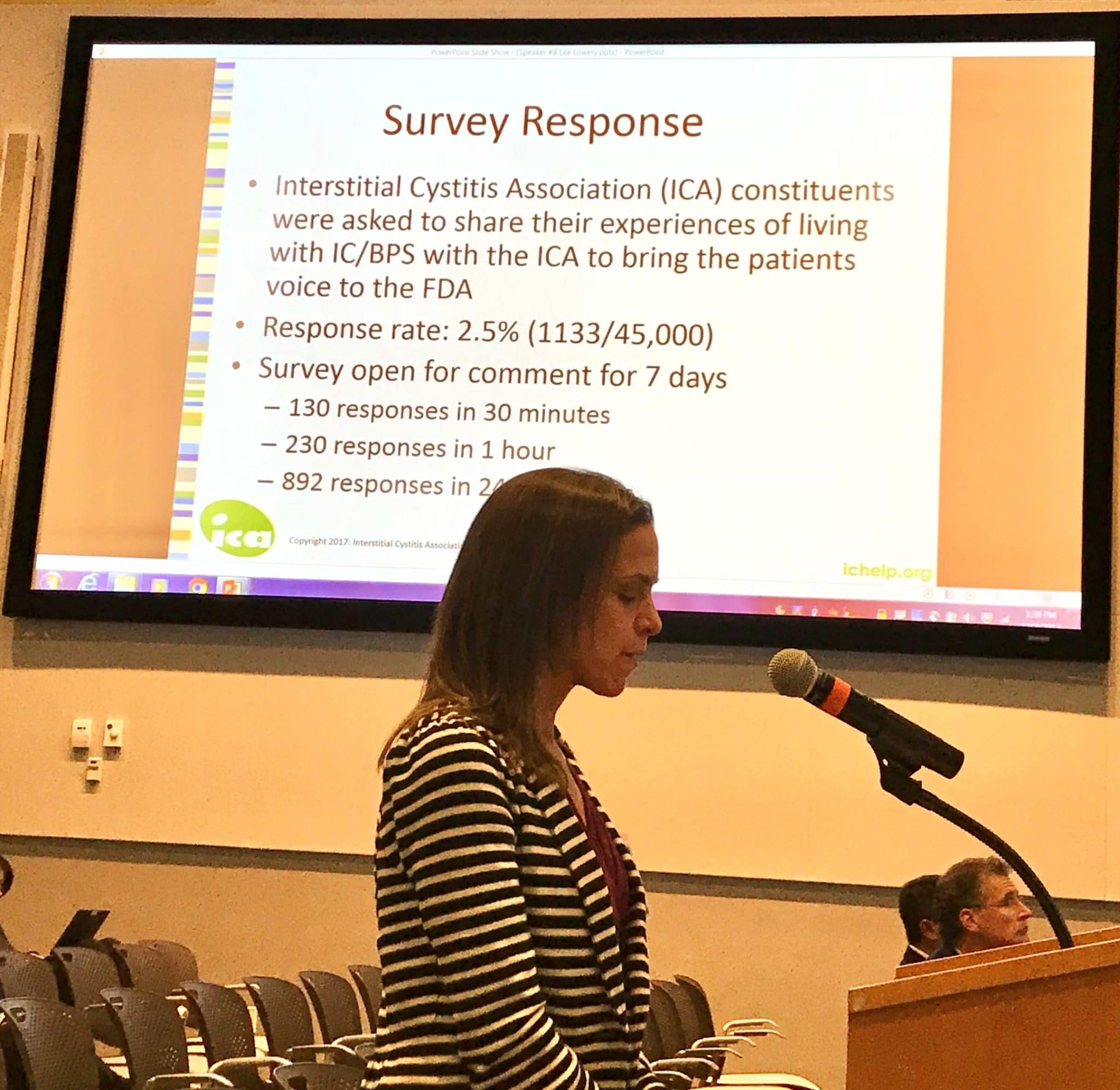 ICA staff, board members, and IC patients headed to the Washington, DC metro area to speak at the Open Public Hearing (OPH) segment of the December 7, 2017 meeting of the Bone, Reproductive and Urologic Drugs Advisory Committee at which the committee discussed appropriate patient selection criteria and clinical trial design features, including acceptable endpoints, for demonstrating clinical benefit for drugs intended to treat interstitial cystitis (IC) and bladder pain syndrome. The committee also discussed whether bladder pain syndrome and IC reflect overlapping or different populations, and whether it is appropriate to assess efficacy in the same way for both conditions. At the conclusion of the day, the committee voted unanimously to include both IC and BPS patients in the same clinical trials, which is recommended in ICA’s Position Statement. The recorded audio, slides, and other meeting materials will be made available on the FDA website in January.